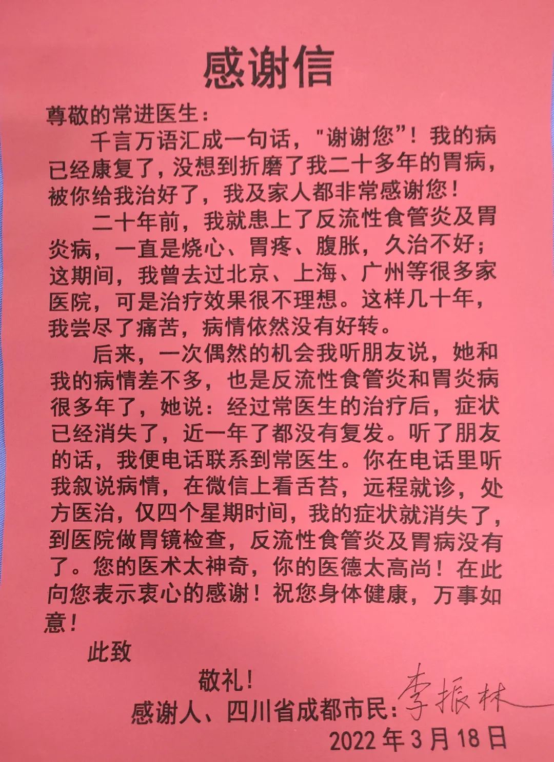 患者李振林先生飽受反流性食管炎及胃炎病二十余年的困擾,曾去過(guò)多地尋醫(yī)問(wèn)診,但療效一直很不理想,經(jīng)朋友推薦聯(lián)系到常主任,經(jīng)遠(yuǎn)程就診用藥,僅用了四個(gè)星期病癥完全消失且再無(wú)復(fù)發(fā)。李先生非常感激,特意訂制了“醫(yī)術(shù)精湛手到病除 醫(yī)德高尚名揚(yáng)天下”的錦旗,向常主任表達(dá)了衷心的感謝。